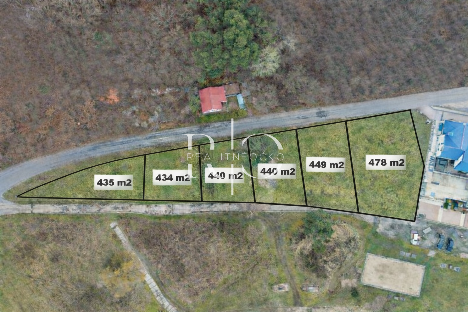 - Rozloha pozemkov: 465m2, 450m2, 440m2, 440m2, 434m2, 436m2