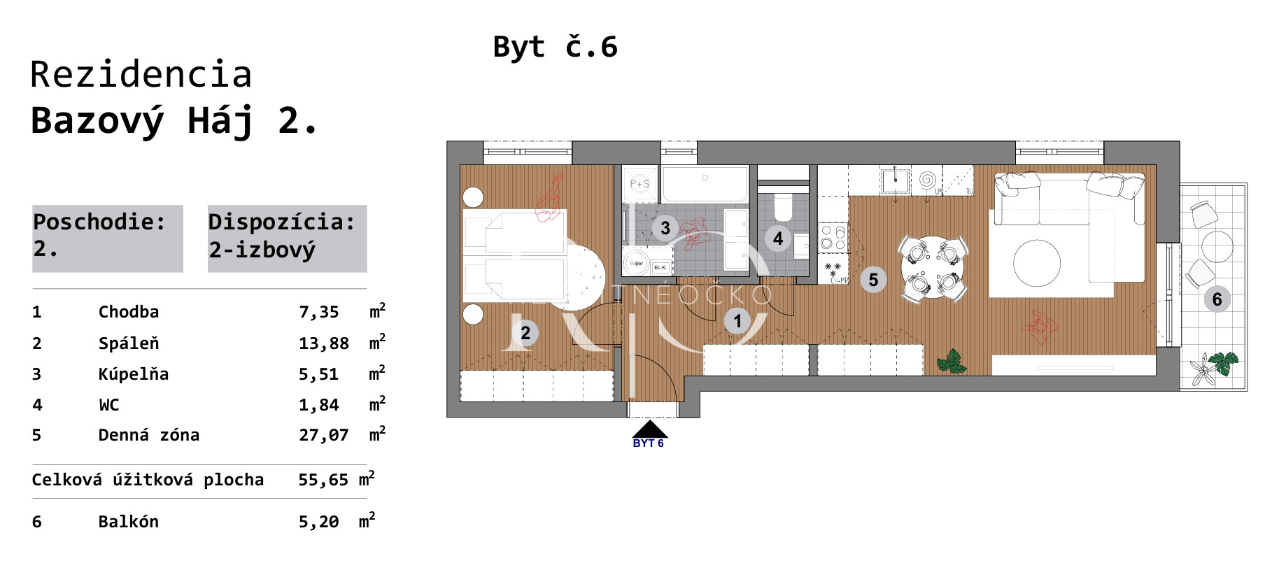 Na predaj moderný 2 izbový byt na 2 poschodí o výmere 55,65 m2 v Rezidencii Bazový háj – Bzovík