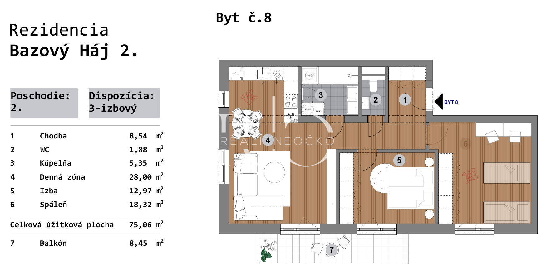 Na predaj moderný 3 izbový byt na 2 poschodí o výmere 75,06 m2 v Rezidencii Bazový háj – Bzovík
