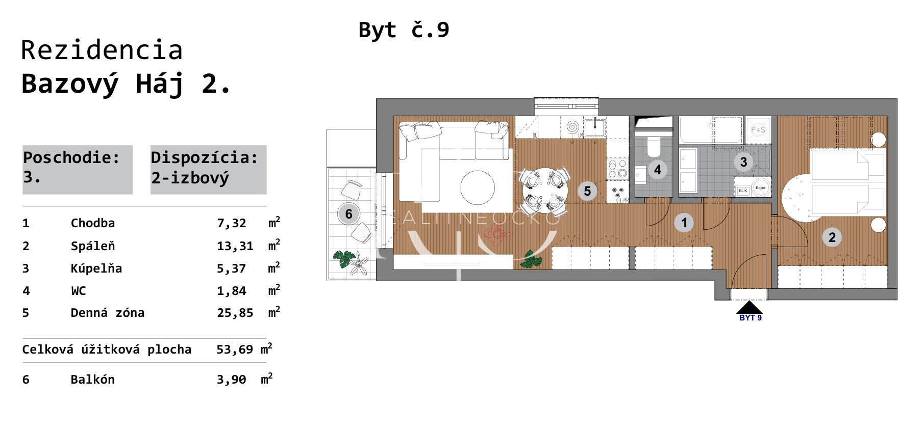 Na predaj moderný 2 izbový byt na 3 poschodí o výmere 53,69 m2 v Rezidencii Bazový háj – Bzovík