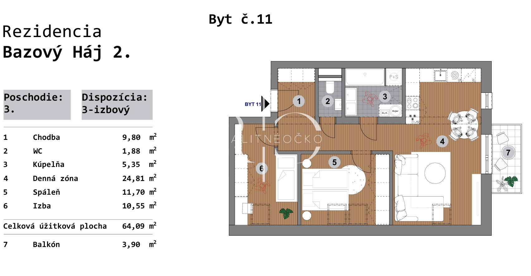 Na predaj moderný 3 izbový byt na 3 poschodí o výmere 64,09 m2 v Rezidencii Bazový háj – Bzovík